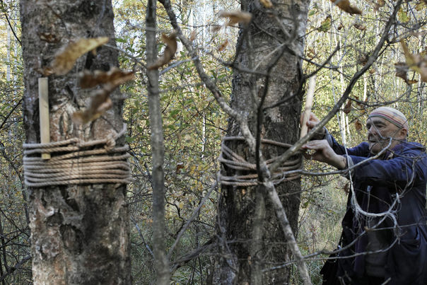 Участники акции покинули просеку, оставив инсталляцию с портретом и веревками на месте действия.