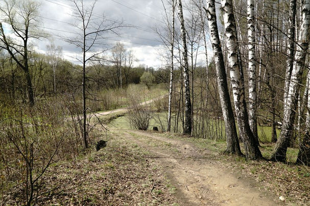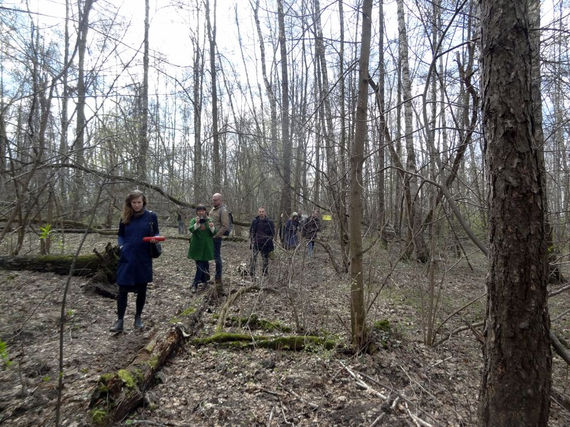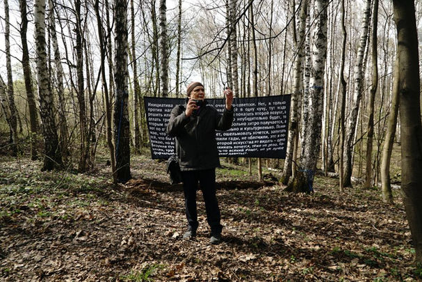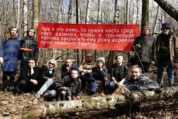 Next, the group of participants walked into the woods to the north of the Yauza river. While the group was moving through the woods, the black, yellow and red banners were hung in-between the trees. The distance between the banners was determined by their invisibility so that the previous banner is not seen from the position where the new one is hung.