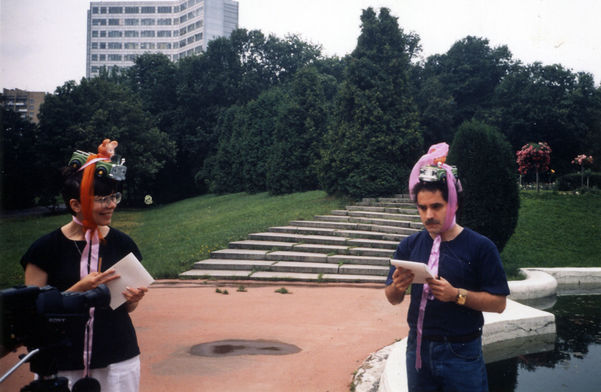 Приглашенным на акцию Альчук и Рыклину были надеты на головы и укреплены разноцветными лентами детские машинки с резиновыми мишками. Проходя по дорожкам розария, они списывали в блокноты названия видов роз с металлических табличек.