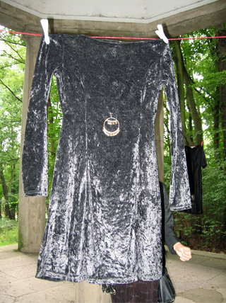 Между колонн каменной беседки в парке на красной веревке было повешено шесть черных платьев. На каждом платье с передней стороны были прикреплены фотографии 10х15 см (четыре фотографии – сняты накануне на башне Луису Бергеру, недалеко от беседки, две фотографии сняты также накануне в самой беседке). На задней стороне платьев была повешена дешевая «золотая» бижутерия. В центре беседки на каменной тумбе работал магнитофон, воспроизводящий саунд–трэк советского фильма 1949 г. «Александр Попов» (режиссеры Г. Раппапорт, В. Эйсымонт). Рядом с магнитофоном на тумбе стояла фотография (13х18 см) в красной рамке, изображающая фрагмент архитектурного декора здания радиостанции «Коотвайк» (Голландия). Построив таким образом инсталляцию, устроители акции поднялись на башню Луису Бергеру, затем вернулись в беседку, сняли платья и, оставив на тумбе работающий магнитофон и фотографию радиостанции «Коотвайк», ушли с места действия.